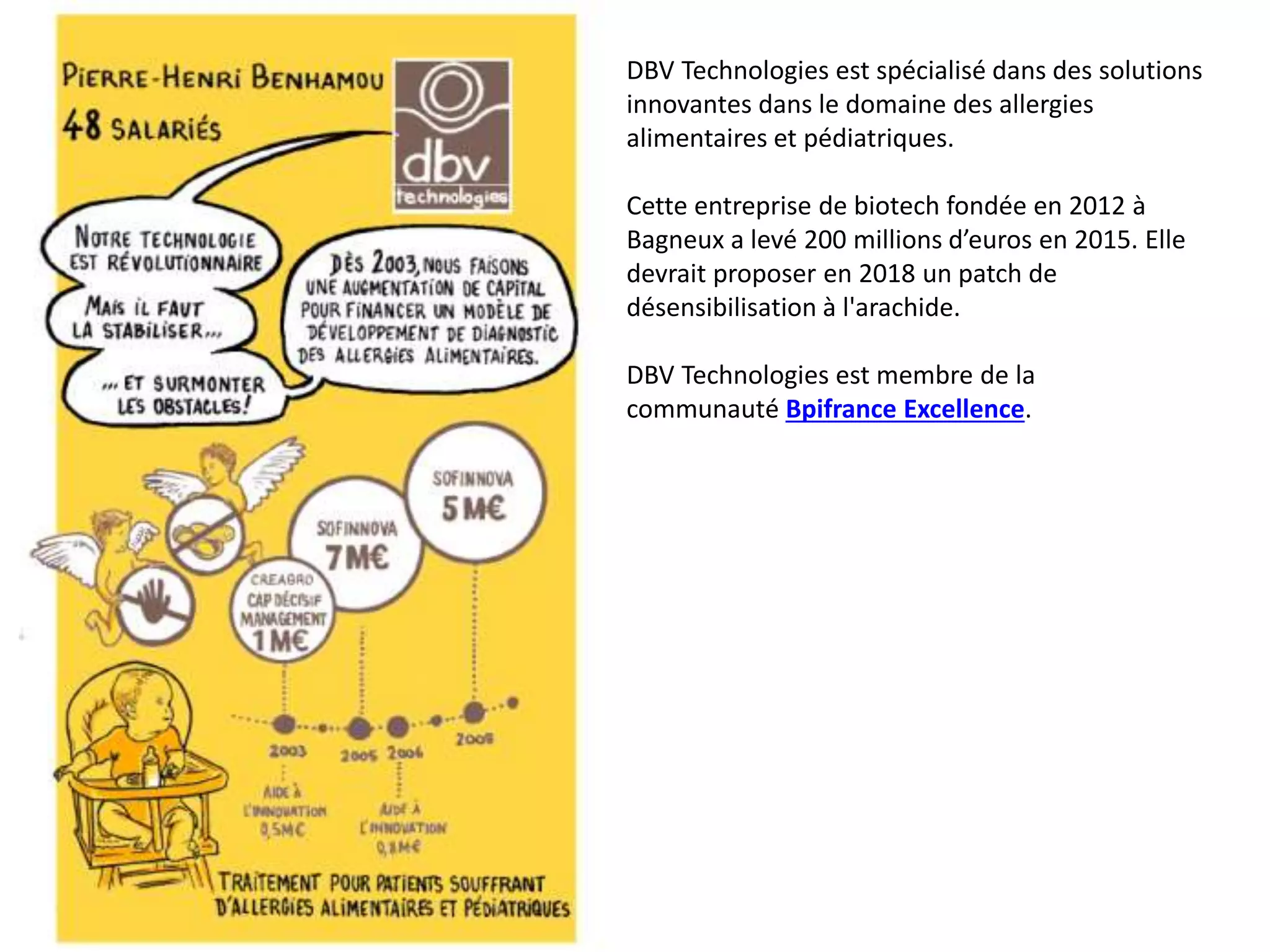DBV Technologies est une entreprise biotech fondée en 2012 à Bagneux, spécialisée dans des solutions pour les allergies alimentaires et pédiatriques. En 2015, elle a levé 200 millions d'euros et prévoit de lancer un patch de désensibilisation à l'arachide en 2018. L'entreprise est également membre de la communauté Bpifrance Excellence.