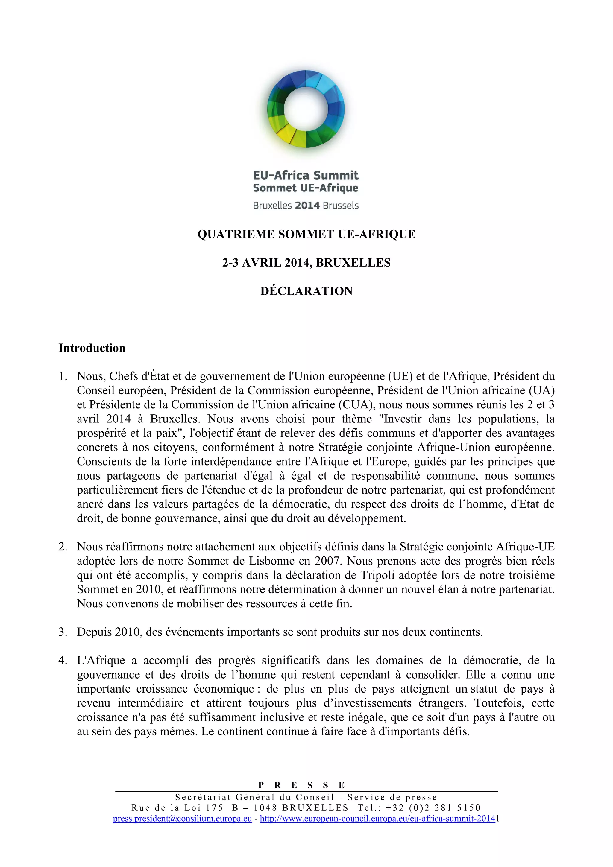 Lors du quatrième sommet UE-Afrique en avril 2014 à Bruxelles, les dirigeants ont réaffirmé leur engagement à renforcer leur partenariat sous le thème 'investir dans les populations, la prospérité et la paix'. Ils ont souligné l'importance de la paix et de la sécurité pour le développement, et ont convenu de travailler ensemble sur des enjeux communs tels que la lutte contre le terrorisme, l'illettrisme économique et la promotion d'une croissance inclusive. Les participants ont promis de mobiliser des ressources pour transformer leurs relations et faire face à des défis partagés.