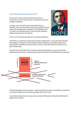 Le document explique l'importance de la première impression dans la perception d'un homme politique, en la comparant à un point d'ancrage mémoriel qui influence le jugement des citoyens. Il souligne que cette impression se résume à un adjectif qui agit comme un filtre pour toutes les informations futures, et qu'il est crucial pour un politicien de choisir un 'riff' qui représente sa qualité la plus attrayante et correspond aux attentes des électeurs. En définitive, le 'riff' doit être soigneusement élaboré et imposé pour optimiser l'image de l'homme politique auprès du public.