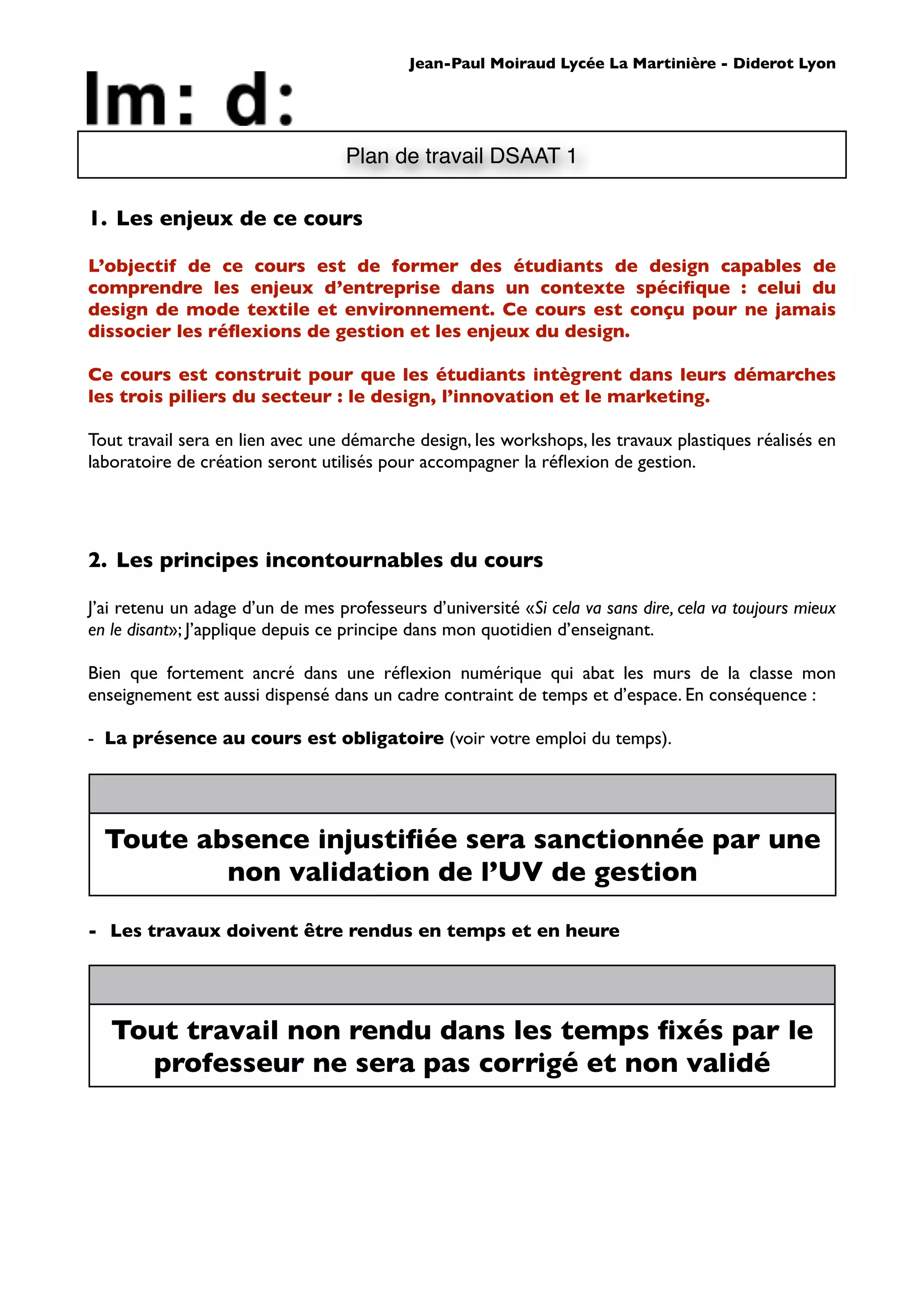 Le cours de gestion au lycée La Martinière - Diderot vise à former des étudiants en design, en intégrant les dimensions de la gestion, du design, et du marketing dans un contexte de mondialisation. Les étudiants doivent développer des compétences technologiques et collaboratives tout en réalisant divers travaux pratiques et synthèses. Le programme est structuré autour de thématiques précises, de lectures obligatoires et d'un planning d'activités annuelles, avec une forte composante de veille informationnelle.