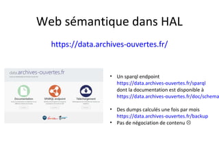 Le document présente un endpoint SPARQL pour accéder aux données de HAL, permettant de rechercher et de manipuler les métadonnées des documents académiques. Il fournit également des exemples de requêtes et des astuces pour extraire des informations telles que les versions de documents, les auteurs, et les types de publications. En outre, il aborde des techniques d'agrégation et de filtrage pour analyser les données liées aux recherches académiques.