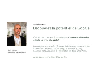 Eric Perreault, spécialiste en marketing web, souligne l'importance de Google comme source principale de trafic pour les sites web, avec une distinction claire entre SEO (référencement naturel) et SEM (achat de mots-clés). Il met en avant les coûts associés à ces stratégies, le rôle essentiel de Google Analytics pour mesurer les résultats et l'importance de choisir les bons mots-clés pour attirer des visiteurs. Enfin, il invite à le contacter pour toute question ou commentaire sur le sujet.