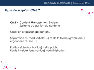 Le document présente WordPress, un CMS (système de gestion de contenu) créé en 2003, permettant la publication et la gestion de contenu divers comme des blogs et des sites e-commerce. Il décrit ses avantages, tels que la facilité d'utilisation et la gestion multi-auteurs, ainsi que ses limites, comme le besoin de connaissances en code pour une personnalisation avancée. Deux options d'utilisation de WordPress sont proposées : via une plateforme en ligne ou une installation sur un serveur.