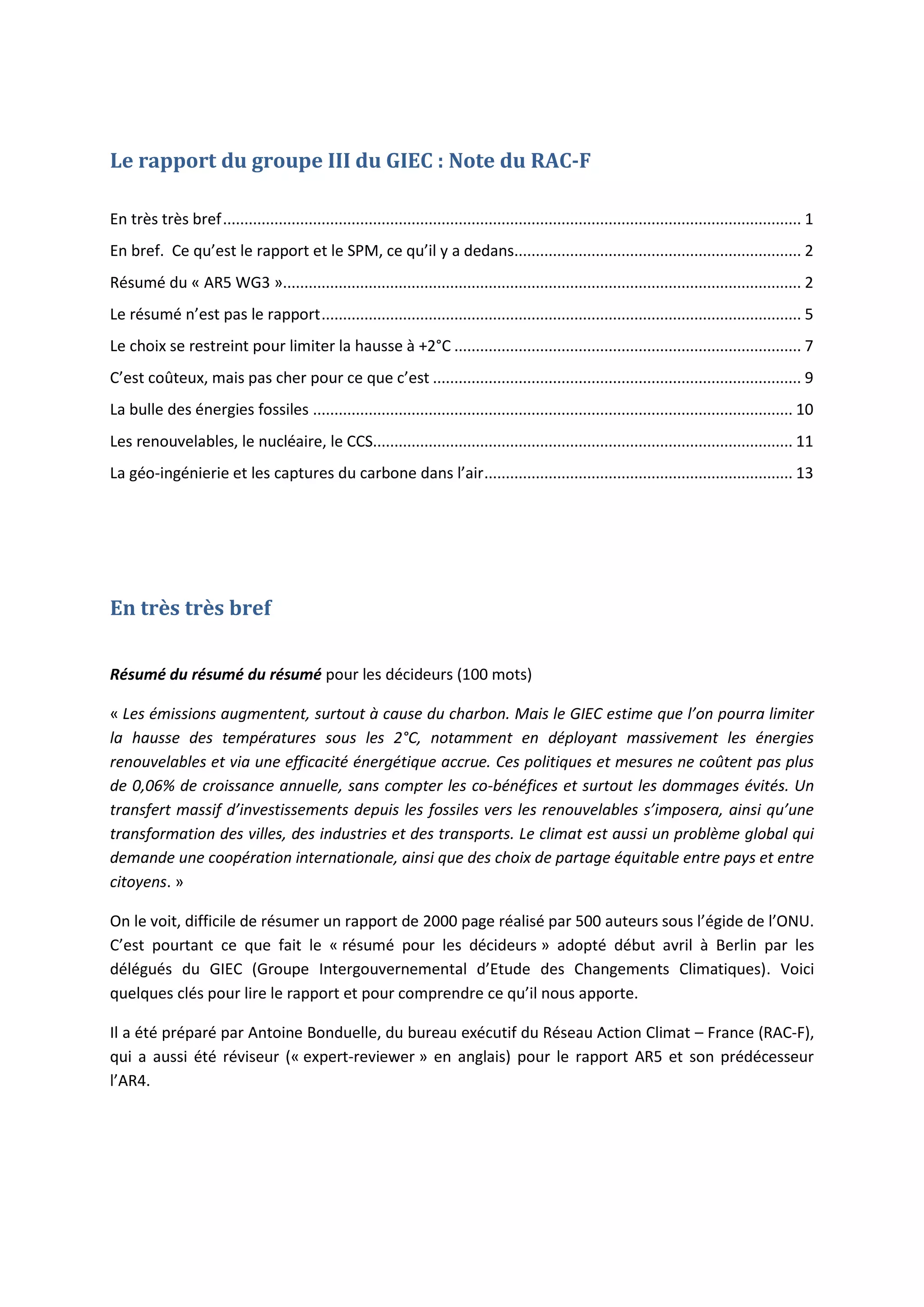 Le rapport du Groupe III du GIEC indique que pour limiter le réchauffement climatique à moins de 2°C, un déploiement massif des énergies renouvelables et des mesures d’efficacité énergétique sont nécessaires, tout en soulignant que les coûts d'action sont minimes comparés aux bénéfices. Les investissements dans les énergies fossiles doivent diminuer considérablement, et des changements radicaux dans la répartition des énergies sont impératifs pour atteindre cet objectif. Enfin, le rapport appelle à une coopération internationale et à des choix équitables entre pays pour faire face à ce défi global.