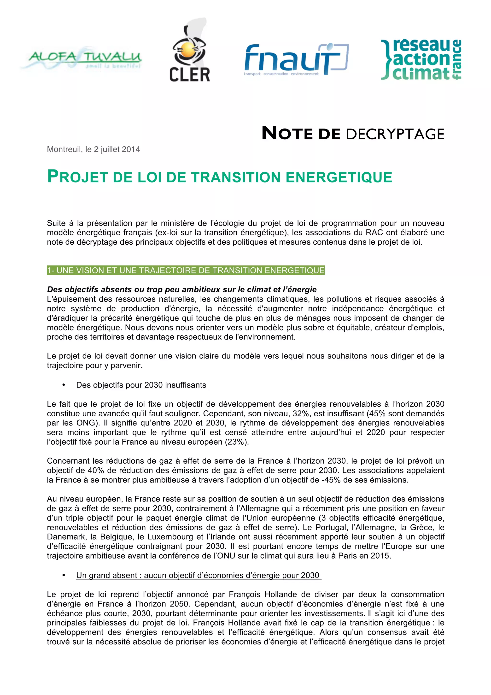 Le projet de loi de transition énergétique en France présente des faiblesses, notamment des objectifs insuffisants pour le développement des énergies renouvelables et l'absence de cibles pour les économies d'énergie d'ici 2030. Les associations soulignent le manque d'ambition dans la réduction des émissions de gaz à effet de serre et une flou concernant l'avenir du nucléaire. De plus, les mesures concernant les transports favorisent les véhicules électriques sans promouvoir une diversification des modes de transport durables.