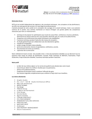 DCTS Structuri SRL est une société roumaine indépendante spécialisée dans l'ingénierie, la conception et le conseil technique, offrant des services variés tels que la conception d'ouvrages, l'expertise technique et la supervision de la construction. La société s'engage à respecter des normes de qualité élevées et dispose d'une large palette de compétences pour divers types de projets, dont l'agriculture, le secteur public, l'industrie, et le résidentiel. DCTS a réalisé de nombreux projets, incluant des centres commerciaux, des universités, et des bâtiments résidentiels à Bucarest et ailleurs.
