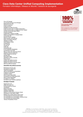 La formation certyou sur l'implémentation du système Cisco Unified Computing (UCS) à Paris permet aux participants d'acquérir des compétences pour déployer et gérer des solutions Cisco UCS, en se concentrant sur la configuration, la tolérance de panne et la gestion multi-locataire. Destinée aux ingénieurs système, réseaux et techniciens, elle requiert des connaissances de base en administration serveur et sur les concepts LAN/SAN. La formation inclut également un coaching post-formation et prépare à une certification officielle Cisco.