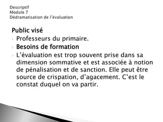 Le document examine les besoins de formation des enseignants du primaire concernant l'évaluation, soulignant l'importance de l'évaluation formative pour dédramatiser le processus et améliorer la motivation des élèves. Il propose des outils et des approches axés sur les intelligences multiples, favorisant l'interaction et l'échange d'idées entre enseignants pour mieux comprendre et appliquer des stratégies d'évaluation. L'objectif est de transformer l'évaluation en un outil d'apprentissage qui renforce la confiance en soi et l'auto-évaluation des élèves.