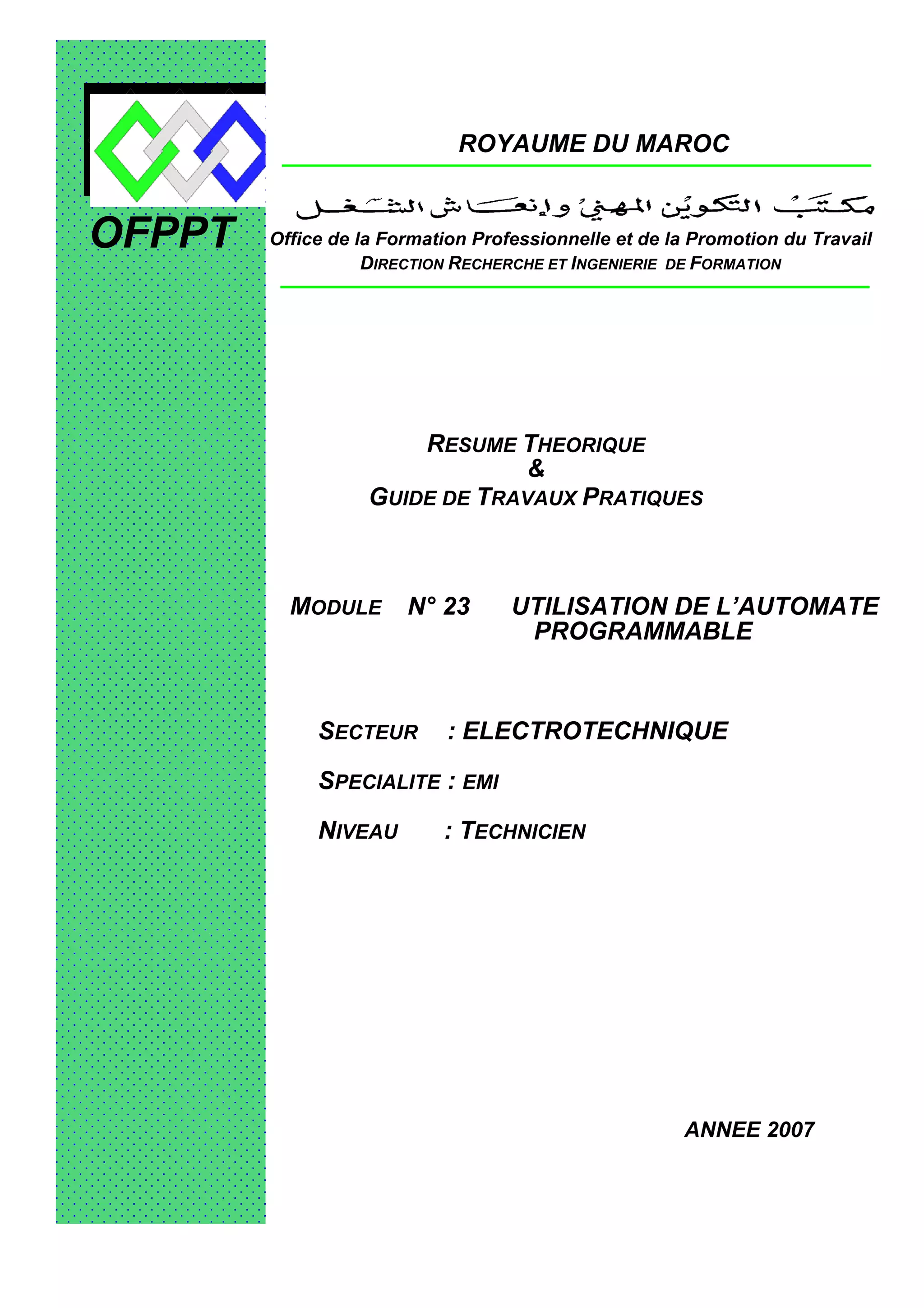 Ce document est un guide complet sur l'utilisation des automates programmables dans le cadre de la formation professionnelle en électrotechnique. Il couvre des aspects théoriques tels que la structure et le fonctionnement des automates, ainsi que des exercices pratiques pour le raccordement et la programmation. L'objectif principal est de rendre les stagiaires compétents dans l'utilisation des automates pour résoudre divers problèmes techniques et améliorer la productivité.