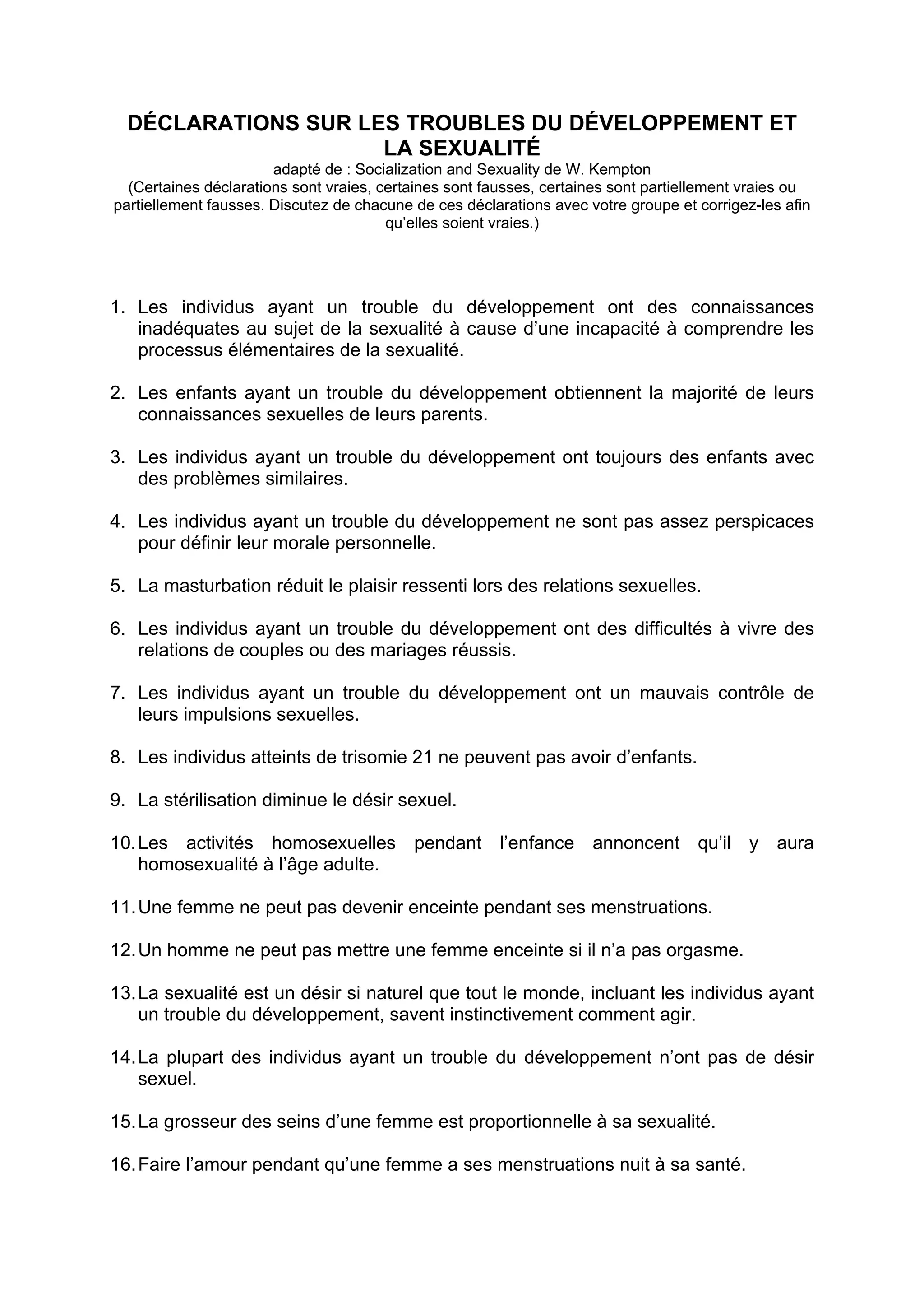 Le document aborde des déclarations sur les troubles du développement et la sexualité, certaines étant vraies, fausses ou partiellement vraies. Il souligne l'importance de corriger ces idées fausses à travers des discussions de groupe et de fournir une éducation sexuelle appropriée, tenant compte des besoins spécifiques des individus concernés. Des recommandations pour une éducation sexuelle efficace sont également présentées, incluant l'adaptation des méthodes d'enseignement et l'inclusion des normes culturelles.
