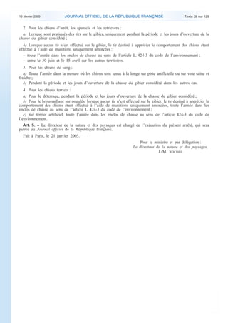 L'arrêté du 21 janvier 2005 fixe des conditions pour les entraînements, concours et épreuves de chiens de chasse en France. Il impose une demande d'autorisation auprès du préfet pour organiser ces manifestations, précisant divers détails sur l'événement et les chiens participants. Certaines périodes et conditions sont spécifiées pour chaque type de chien lors de l'entraînement.