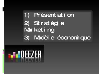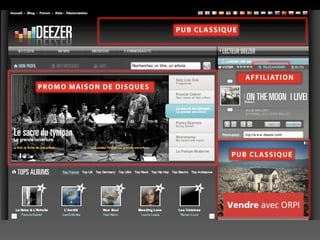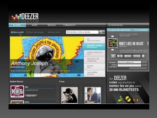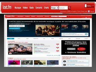 Le document présente deux plateformes de musique en ligne, Deezer et Last.fm, en détaillant leur stratégie marketing, leur modèle économique et leurs avantages et inconvénients. Deezer, avec 3,7 millions de titres, opère sur un modèle financé par la publicité et s'est positionné comme un réseau social, tandis que Last.fm utilise un système de recommandations basé sur le 'scrobbling' pour personnaliser l'expérience de ses utilisateurs. Les deux services offrent des options gratuites et payantes, mais chacun a ses propres défis en matière de contenu et d'engagement communautaire.