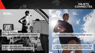 Le document analyse la compréhension et l'usage des objets connectés par les Français, soulignant leur popularité croissante avec 92% ayant entendu parler de ces technologies. Une étude montre que 23% des Français possèdent au moins un objet connecté, principalement pour des améliorations de santé et de confort domestique, mais soulève aussi des préoccupations sur la dépendance et l'obsolescence rapide. Enfin, il aborde les défis d'interopérabilité des systèmes et l'importance de la sécurité des données dans un écosystème connecté.