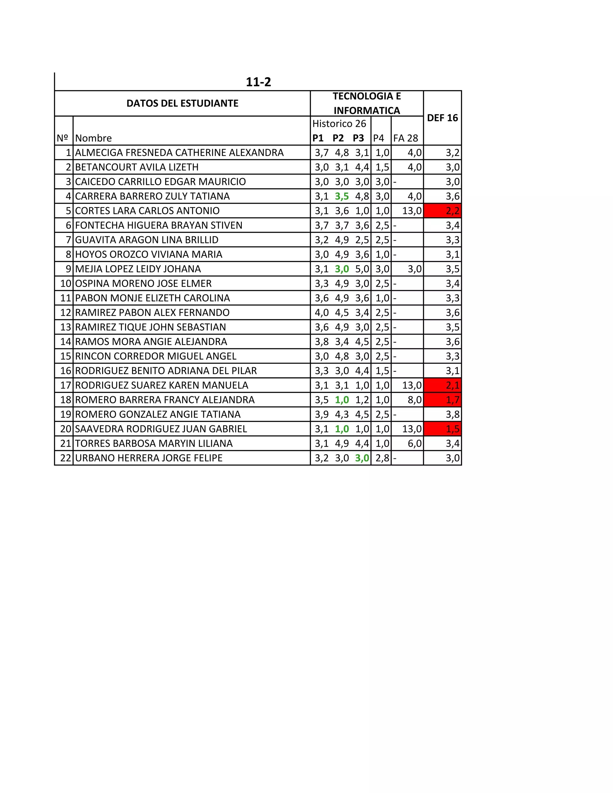 El documento presenta una lista de estudiantes con sus nombres y calificaciones en diversas materias. Se organizan los datos en columnas, donde cada fila corresponde a un estudiante y sus respectivas notas. La información sugiere un enfoque académico en Tecnología e Informática.