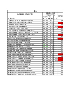 Ce document présente des données d'évaluation concernant divers étudiants en technologie et informatique, y compris leurs notes dans plusieurs matières. Les résultats sont fournis pour chaque étudiant avec des scores dans diverses catégories, accompagnés de moyennes. Certaines entrées montrent des résultats marquants, tels que des notes de 4,9 et des scores variant d'un étudiant à l'autre.