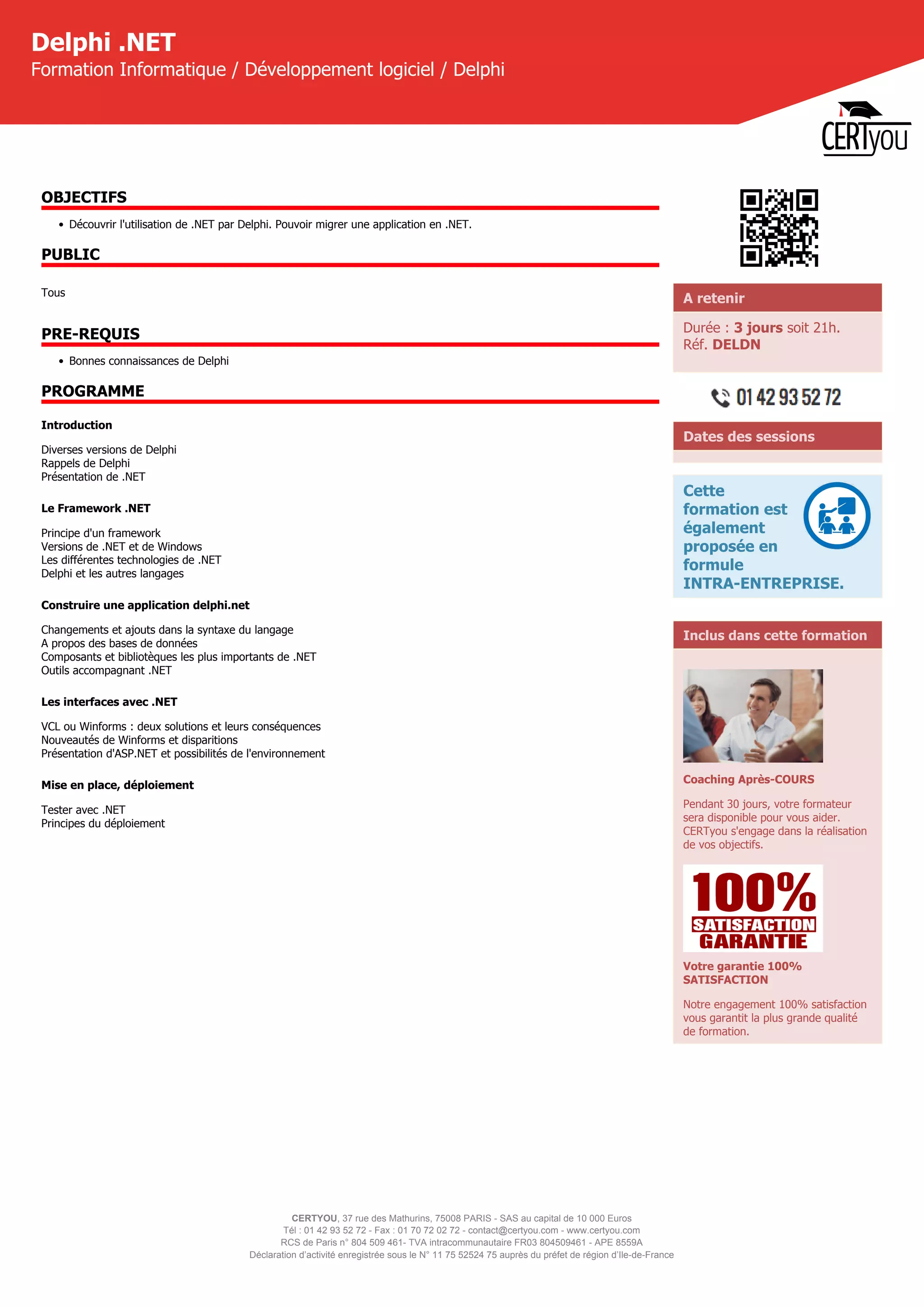 Certyou propose une formation sur l'utilisation de .NET avec Delphi, visant à migrer des applications vers ce framework. La formation de 3 jours aborde divers aspects des technologies .NET et inclut un coaching de 30 jours après le cours pour assurer la satisfaction des participants. Certyou s'engage à offrir une qualité de formation optimale avec une garantie de 100% de satisfaction.