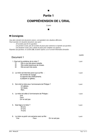 Le document décrit les modalités de l'examen DELF B1, incluant les épreuves de compréhension orale, écrite, production écrite et orale, avec leurs durées et critères de notation. Il détaille également les types d'exercices et les attentes pour chaque partie de l'examen. Enfin, il aborde des concepts liés à l'intégration des personnes handicapées sur le marché du travail et les préjugés qui les touchent.