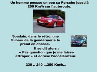 Un homme conduisant sa Porsche à grande vitesse est poursuivi par la gendarmerie. Lorsqu'il est arrêté, le policier lui demande une excuse originale pour éviter un rapport. L'homme explique que, croyant que c'était le policier qui revenait avec sa femme, il a accéléré, et le policier le laisse partir en lui conseillant de conduire prudemment.