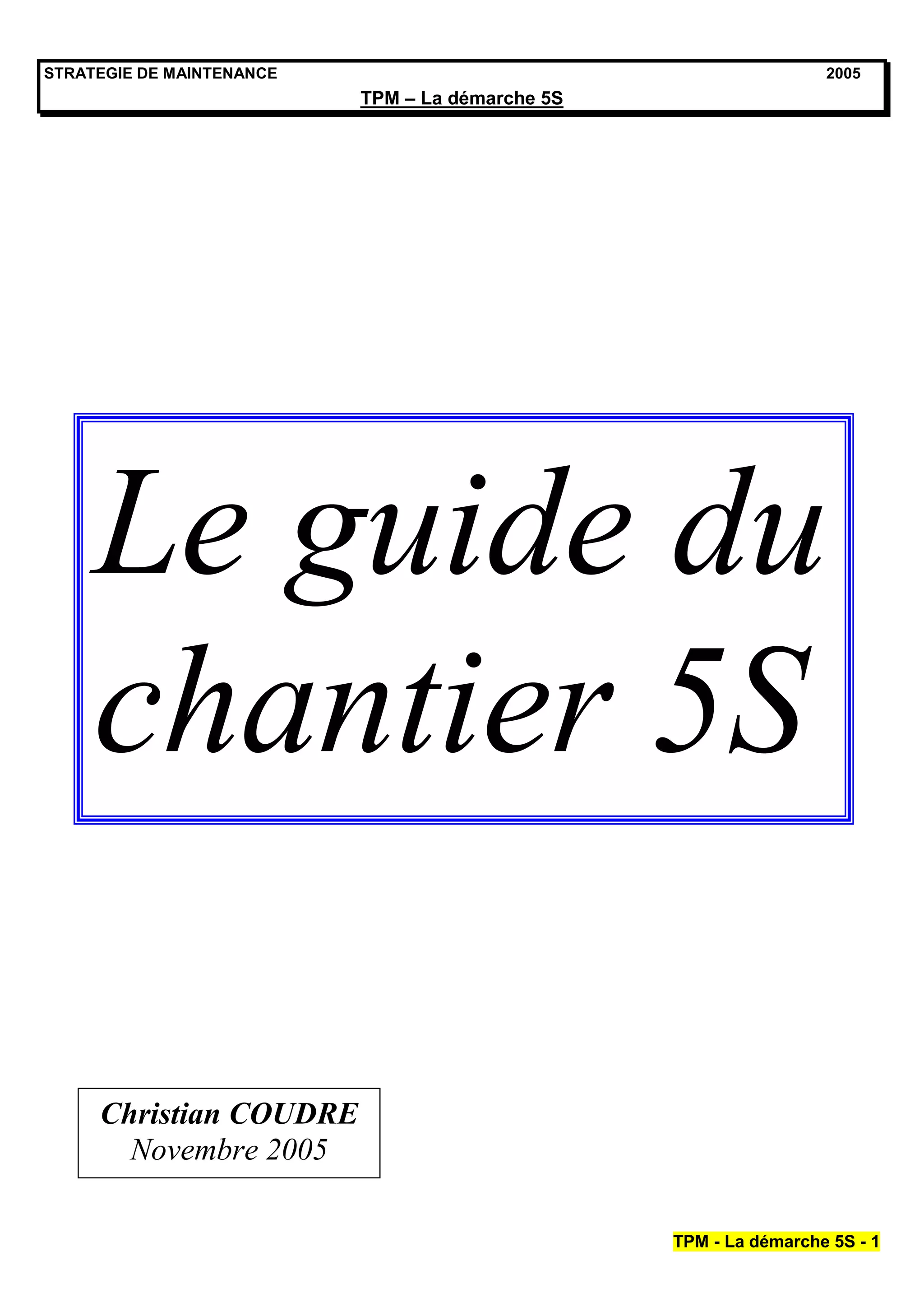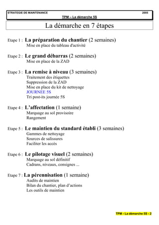 Le document présente la stratégie de maintenance 5S, décrivant un processus en 7 étapes qui inclut la préparation du chantier, le grand débarras, et le maintien des standards établis. Chaque étape est accompagnée d'objectifs spécifiques, de méthodes d'organisation et de conseils pratiques pour assurer l'amélioration continue des environnements de travail. L'accent est mis sur l'importance de la direction et des ressources pour la mise en œuvre réussie de cette démarche.