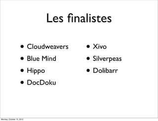 Le document présente les finalistes d'une compétition de logiciels libres en 2012, incluant Cloudweavers, Xivo, Blue Mind, Silverpeas, Hippo, Dolibarr et Docdoku. Les règles stipulent que chaque démonstration doit durer 7 minutes, et le jury évalue les projets sur des critères d'innovation, d'ouverture, de marché et de qualité de présentation. Les gagnants de cette édition sont Blue Mind, Docdoku et Hippo.