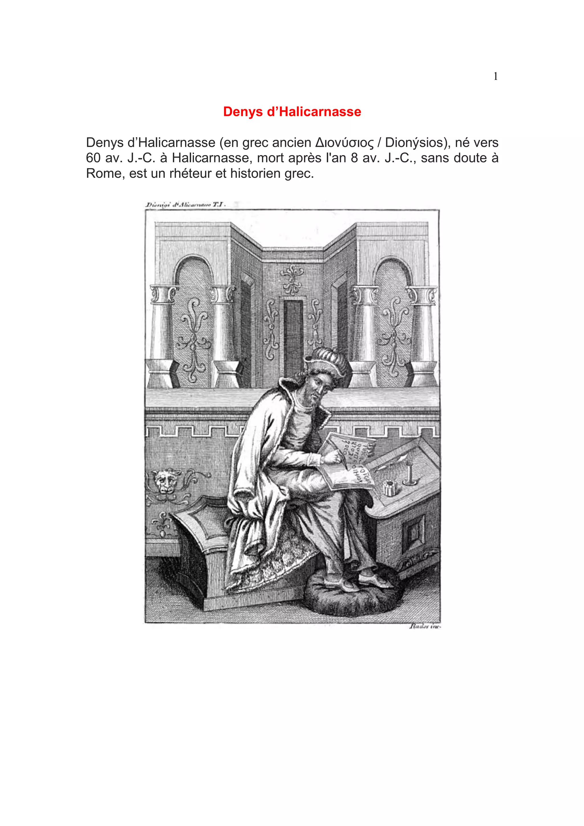 Denys d'Halicarnasse, rhéteur et historien grec né vers 60 av. J.-C., est connu pour son œuvre majeure 'Antiquités romaines', qui retrace l'histoire de Rome depuis ses origines légendaires jusqu'à la première guerre punique. En plus de son travail historique, il a contribué à la rhétorique avec plusieurs traités sur des orateurs grecs et des réflexions sur le style littéraire. Bien que ses ouvrages aient souvent été fragmentaires, il reste une figure importante pour la compréhension de l'historiographie romaine.