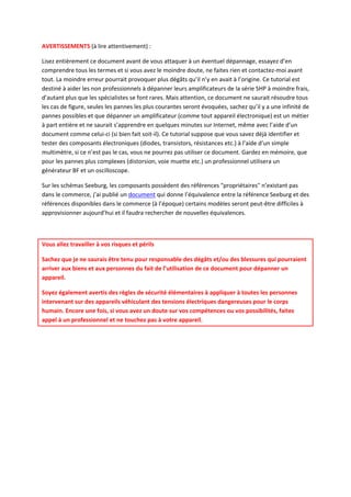 Ce document propose un guide de dépannage pour les amplificateurs Seeburg de type SHP, destiné aux non-professionnels. Il couvre des pannes courantes, des instructions de sécurité à suivre, et des procédures pour vérifier les composants essentiels comme les diodes et les transistors. L'auteur souligne que toute intervention se fait à vos risques et périls et que des connaissances préalables en électronique sont nécessaires pour utiliser ce guide efficacement.
