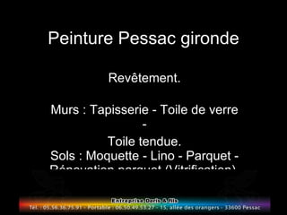 Le document fournit des informations sur les services de peinture et de revêtement offerts à Pessac, Gironde, incluant des options pour les murs et les sols, ainsi que des techniques écologiques de rénovation. Les services incluent l'aérogommage, la vitrification de parquet et le démoussage de toiture. Il mentionne également une offre de devis gratuit et des coordonnées pour un rendez-vous.