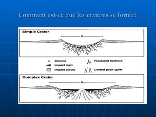 Le document discute de la formation des cratères sur Terre, la Lune, Mars et Vénus, en mentionnant des exemples spécifiques comme Molokini à Hawaï, qui date de 3 millions d'années. Il soulève également la question de la quantité de cratères encore existants aujourd'hui. En outre, il évoque la surface de Vénus, qui présente des cratères et des rivières.