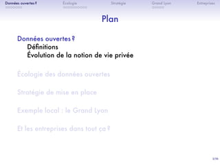 Le document traite des données ouvertes dans l'agglomération de Lyon, en abordant leur définition, leur écologie et les enjeux liés à leur mise en place. Il souligne la nécessité de soutien politique et la collaboration entre entreprises et institutions pour favoriser leur accès et réutilisation. Plusieurs exemples d'initiatives et de défis rencontrés dans ce contexte sont également présentés.