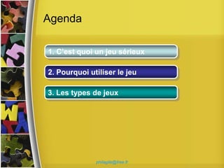 Le document aborde le concept des jeux sérieux, qui allient amusement et apprentissage, en expliquant leur utilité dans le développement personnel et professionnel. Il souligne que le jeu favorise la productivité et l'engagement, tout en permettant d'expérimenter dans un cadre sécurisé. Différents types de jeux sont présentés, tels que les jeux de société et les simulations, utilisés pour l'apprentissage et le renforcement d'équipe.