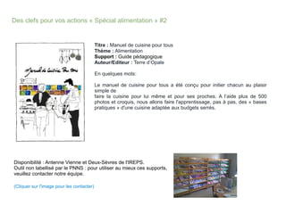 Le document présente une sélection d'outils pédagogiques sur l'alimentation, élaborée par l'IREPS Poitou-Charentes, incluant des supports variés destinés à différents publics. Ces outils visent à sensibiliser et éduquer sur des thématiques comme la cuisine, l'alimentation des jeunes, et l'environnement, tout en respectant les messages du programme national nutrition santé. Chaque ressource est disponible à travers des antennes locales et invite à contacter l'équipe pour un usage optimal.
