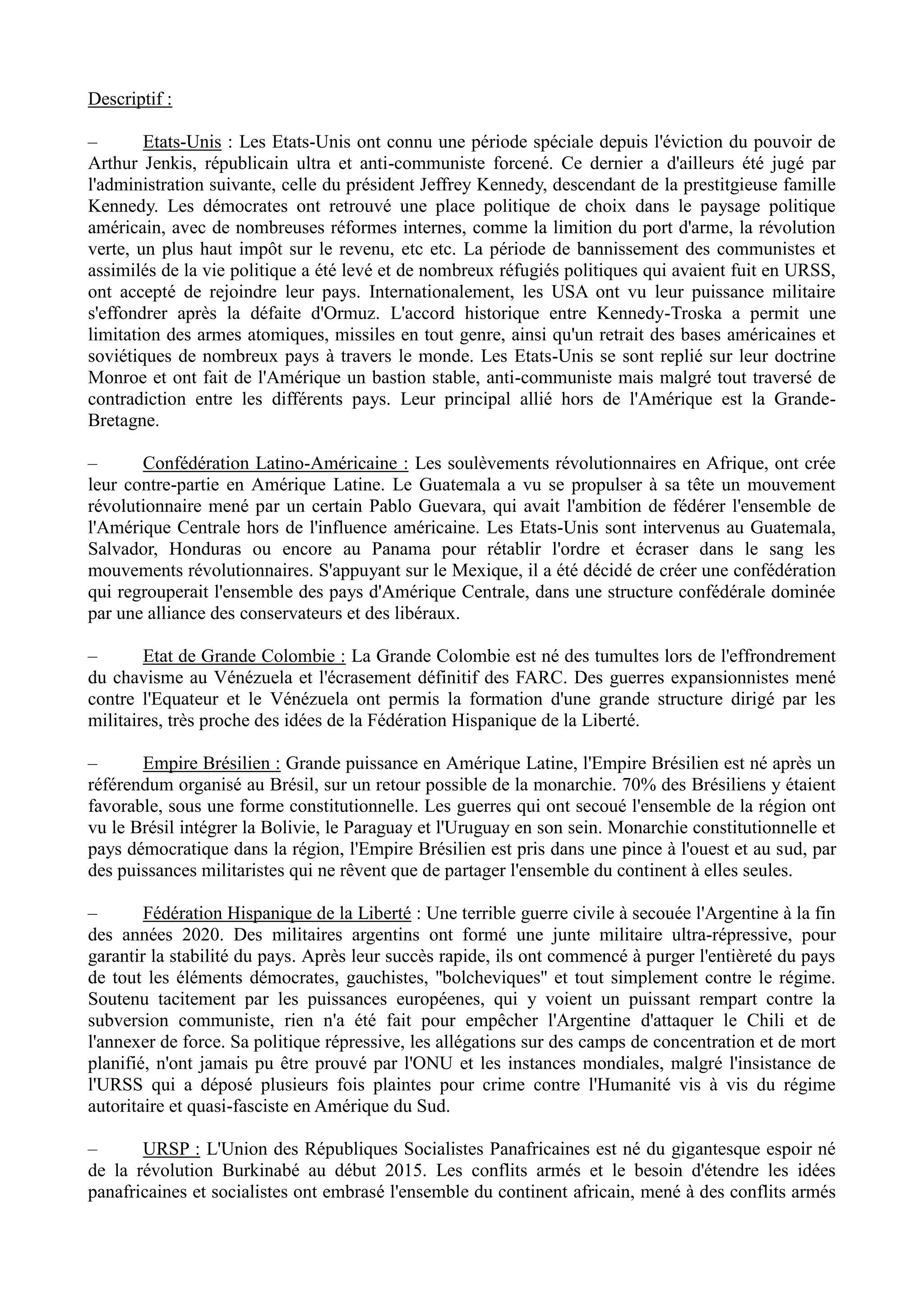 Le document décrit un monde politique contemporain alternatif où divers pays subissent des changements de régime majeurs, avec des révolutions et des tensions entre différentes idéologies. Les États-Unis, après une période d'éviction politique, se replient sur une doctrine monroe tandis qu'en Amérique latine, des mouvements révolutionnaires font face à des interventions américaines. À l'international, la montée de puissances comme la Turquie, le Brésil et l'URSS, ainsi que des évolutions en Afrique et en Asie, redessine la carte géopolitique et les alliances mondiales.