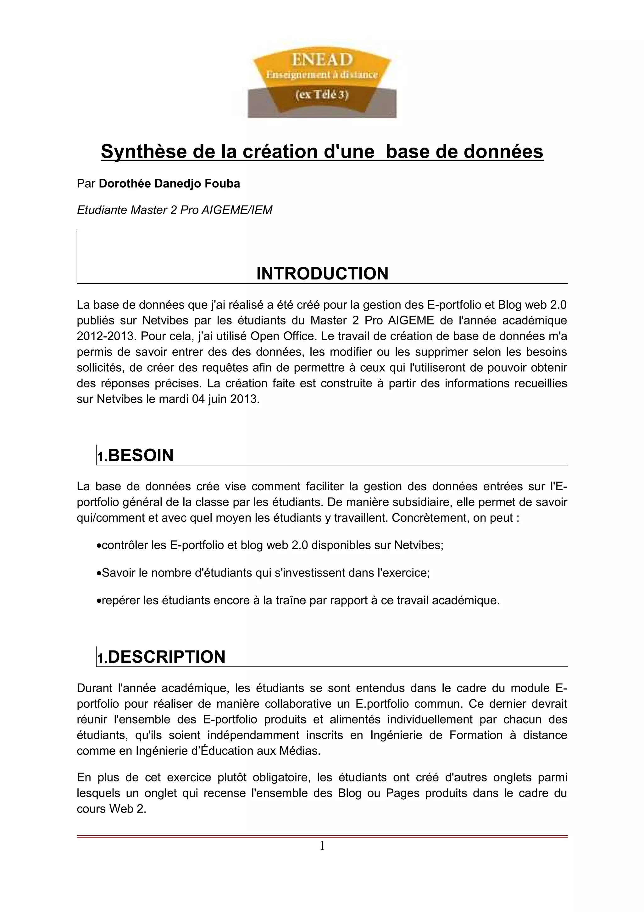 Ce document présente la création d'une base de données pour gérer les e-portfolios et blogs des étudiants du master 2 pro aigeme. Il inclut la description des tables créées, des données collectées et des requêtes permettant de suivre l'engagement des étudiants. L'ensemble a été conçu pour optimiser la gestion académique et faciliter l'analyse du travail effectué par les étudiants.