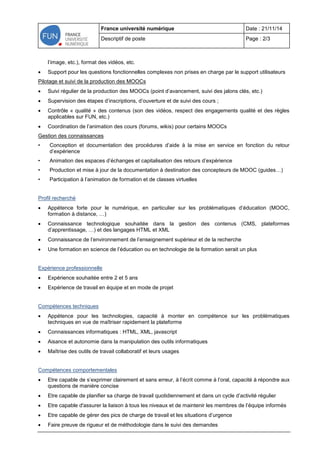 Le document décrit le poste de conseiller au sein de la cellule d'appui de la plateforme France Université Numérique, dédiée aux MOOC. Les responsabilités incluent l’appui et le conseil aux concepteurs de MOOC, la gestion de la production et la documentation des processus. Le candidat idéal doit avoir une expérience en éducation numérique et des compétences technologiques telles que la connaissance de HTML et XML.