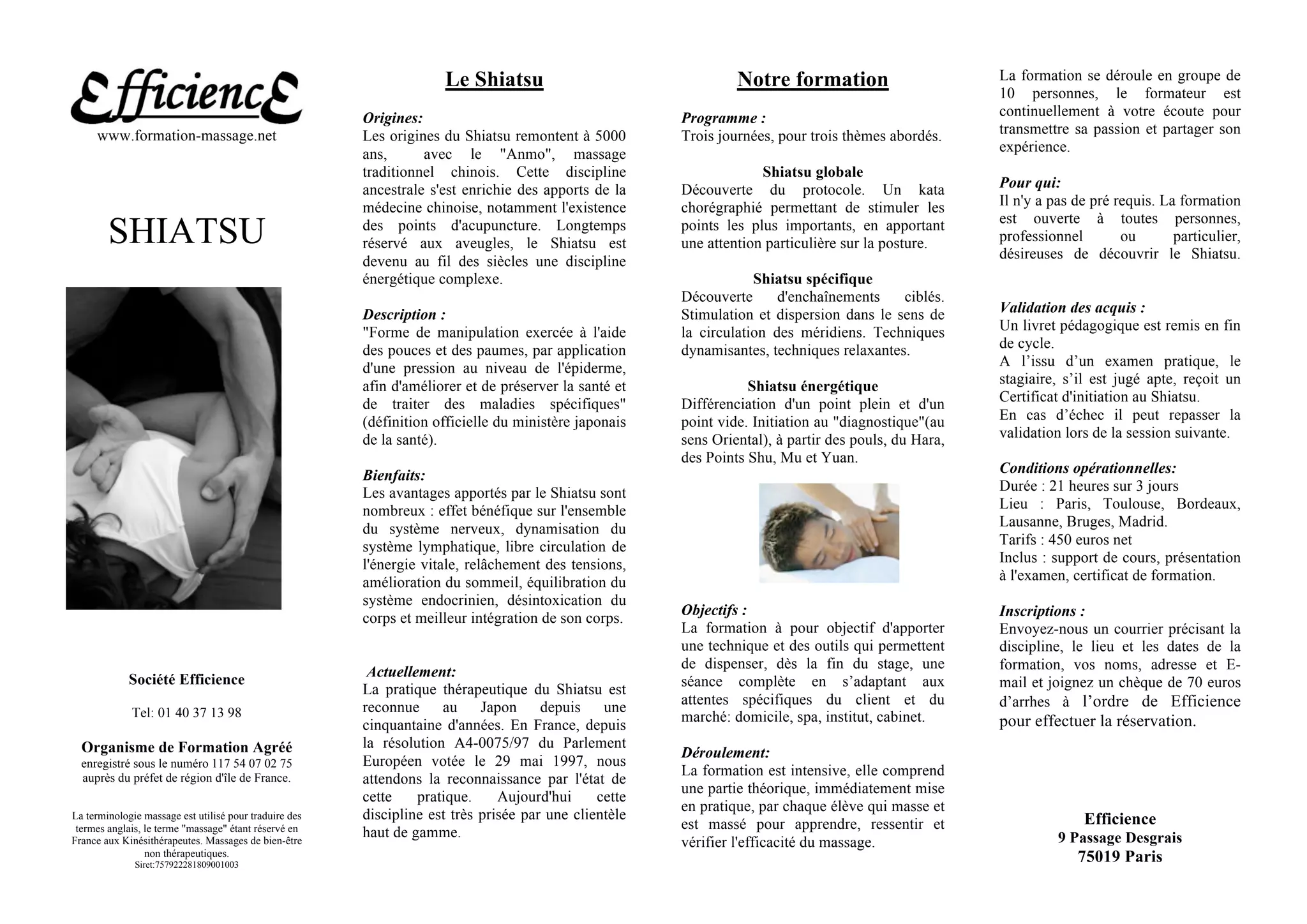 La formation au shiatsu est ouverte à tous et se déroule en groupe de 10 personnes sur 3 jours, abordant des thématiques variées. Elle inclut une partie théorique et pratique, avec certification à la clé, et vise à transmettre des techniques de bien-être et d'amélioration de la santé. La formation est proposée dans plusieurs villes et est reconnue officiellement en France.