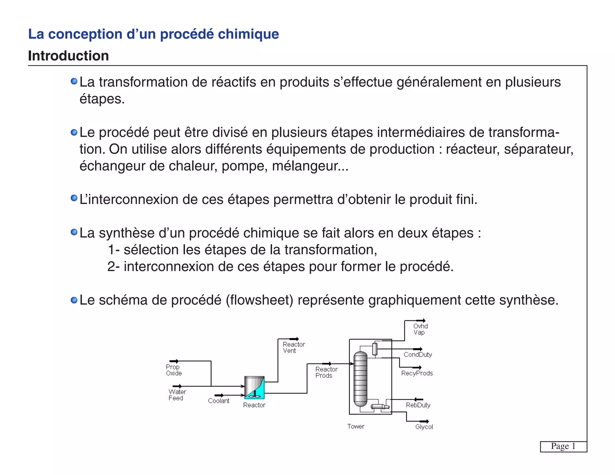 La conception d’un procédé chimique implique plusieurs étapes, de la transformation des réactifs en produits jusqu'à la simulation du comportement du procédé via un schéma de procédé. Les étapes clés comprennent la sélection des transformations, la séparation des produits et réactifs non réagis, et l'optimisation structurelle pour améliorer la performance. La recirculation, la gestion des sous-produits et l'intégration thermique sont essentielles pour maximiser l'efficacité et la rentabilité du procédé.