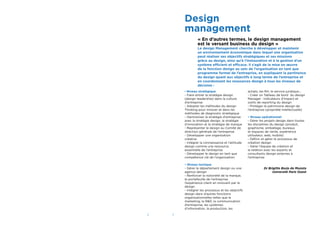 Le design management est essentiel pour intégrer le design en tant que fonction stratégique au sein des entreprises, contribuant à l'innovation, à la compétitivité et à la création de valeur. Des études montrent que les entreprises qui adoptent le design sont plus performantes, innovantes et capables de s'adapter aux changements de marché, en améliorant leur positionnement et leur marquage. En mettant l'accent sur l'expérience utilisateur et en collaborant avec divers départements, le design influence positivement les processus, l'offre et la relation client.
