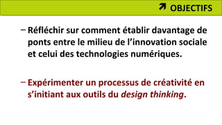 L'atelier sur le design thinking, dirigé par André Fortin et Juliana Alvarez, vise à établir des liens entre innovation sociale et technologies numériques, en expérimentant des processus créatifs. Les participants explorent des thèmes tels que l'innovation ouverte et la technologie au service du bien commun, tout en développant des modèles idéaux et des visions d'accès inclusives. L'atelier souligne l'importance du dialogue continu et de la collaboration pour favoriser des solutions durables.