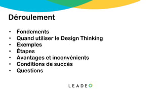 Le design thinking est une approche innovante centrée sur l'humain qui vise à résoudre des problèmes complexes en ayant recours à l'empathie et à la collaboration. Elle se compose de plusieurs étapes clés, y compris la compréhension des besoins des utilisateurs, la génération d'idées et le prototypage, tout en favorisant une culture d'expérimentation. Bien qu'elle offre de nombreux avantages, comme la possibilité d'explorer diverses perspectives, des défis tels qu'une mauvaise compréhension de l'approche peuvent survenir.