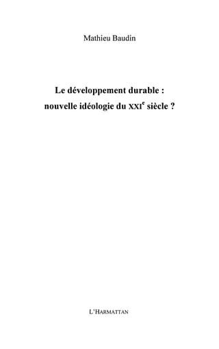 Le document explore le développement durable en tant qu'approche globale du développement humain, abordant ses origines, défis et implications économiques, sociales et environnementales. Il met en lumière la difficulté de définir ce concept et retrace son évolution depuis les années 1950, en mettant en exergue plusieurs événements marquants ayant contribué à la conscience collective concernant les enjeux écologiques. À travers les chapitres, les auteurs examinent des initiatives telles que le commerce équitable et les investissements socialement responsables, tout en discutant des tensions entre développement durable et capitalisme néolibéral.
