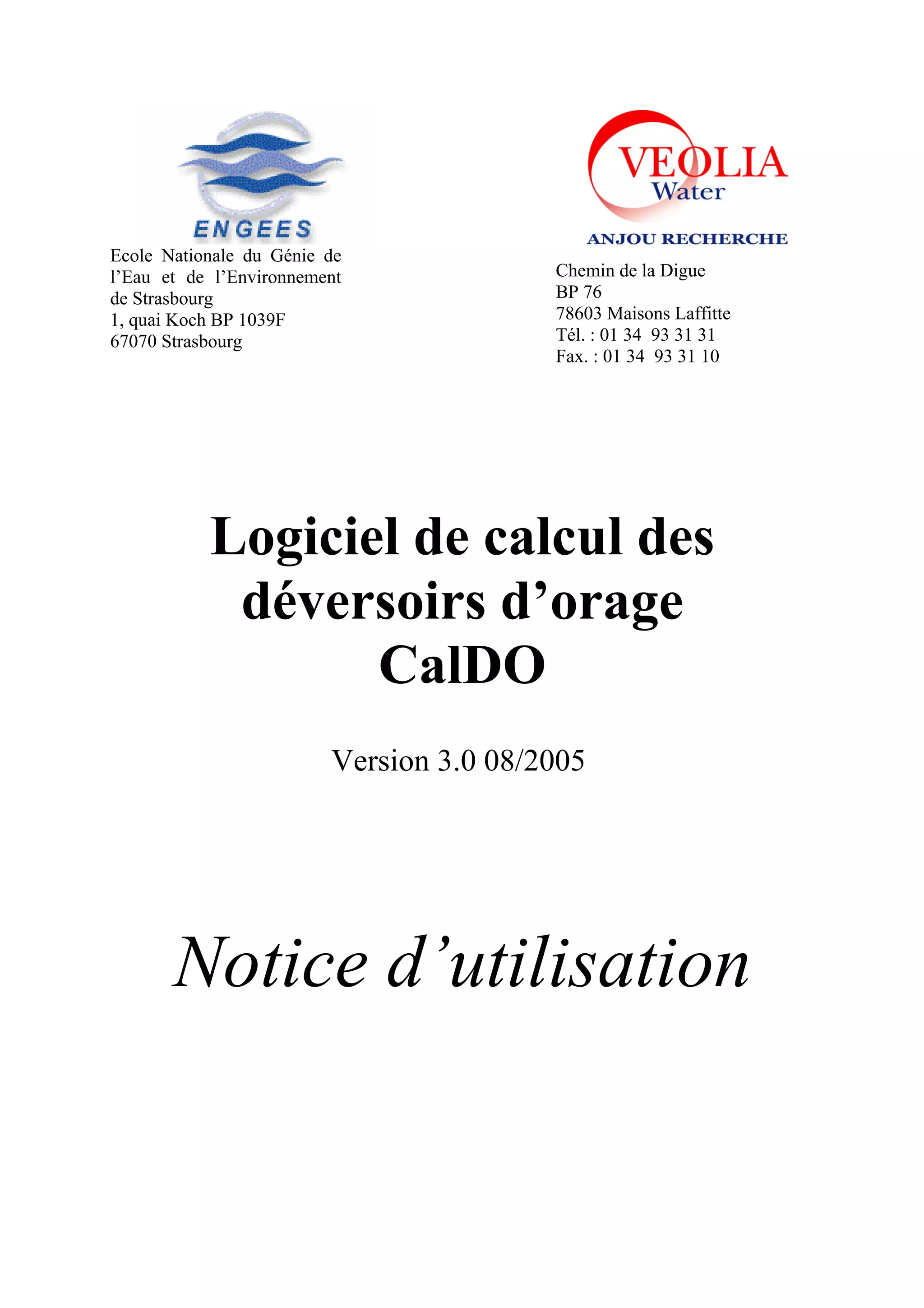 Le document présente le logiciel de calcul des déversoirs d’orage appelé Caldo, mis au point par l'ENGEES et Anjou Recherche - Veolia Water, qui permet de simuler le fonctionnement hydraulique des déversoirs à seuils latéraux. Il détaille ses fonctionnalités, sa mise en œuvre, ses limites, ainsi que les phénomènes hydrauliques pris en compte dans les calculs. La validation des résultats est basée sur des tests effectués en laboratoire, avec des indications sur la précision et les paramètres sensibles lors de son utilisation.