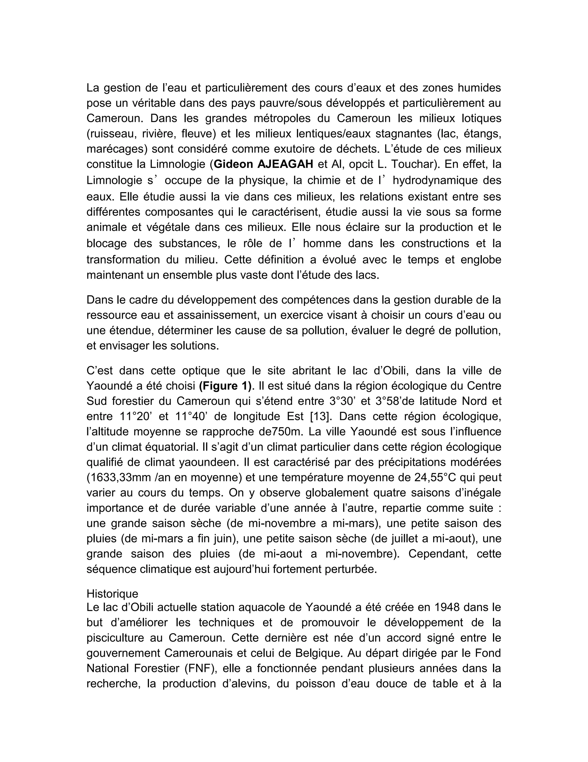 La gestion de l'eau au Cameroun, en particulier des lacs comme celui d'Obili à Yaoundé, comporte de nombreux défis liés à la pollution des milieux aquatiques. Les analyses révèlent que le lac est fortement pollué, avec des indicateurs d'eutrophisation et des niveaux élevés de turbidité, provoqués par le déversement d'eaux usées. Une évaluation de la charge polluante montre que la pollution est prépondérante, impactant la qualité de l'eau et la biodiversité de l'écosystème aquatique.