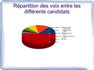 Le tableau présente les résultats du premier tour des élections présidentielles de 2012 en France, avec 46 028 542 électeurs inscrits et 36 584 399 votants. François Hollande a obtenu 28,63% des voix, suivi de Nicolas Sarkozy à 27,18% et Marine Le Pen à 17,90%. Une erreur dans le tableau signale que le nombre d'abstentions devrait être corrigé à 9 441 43.