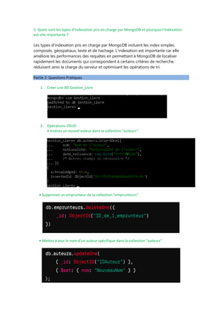 Le document traite des bases de données NoSQL, en particulier de MongoDB, une base de données orientée document qui offre flexibilité et scalabilité par rapport aux bases de données relationnelles. Il décrit les avantages de MongoDB, la structure des documents et des collections, ainsi que divers types d'indexation et leur importance. Une section pratique inclut des tâches CRUD, la création de collections, et des questions sur la gestion des erreurs et la sécurité dans MongoDB.