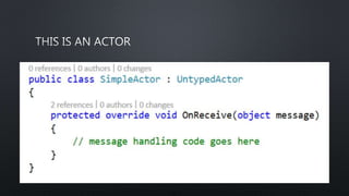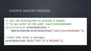 Le document traite d'Akka.NET et de la programmation à état partagé. Il évoque également les tâches, les acteurs et le modèle d'acteur, tout en mentionnant des exemples de messages. Les points clés sont numérotés de 1 à 6.
