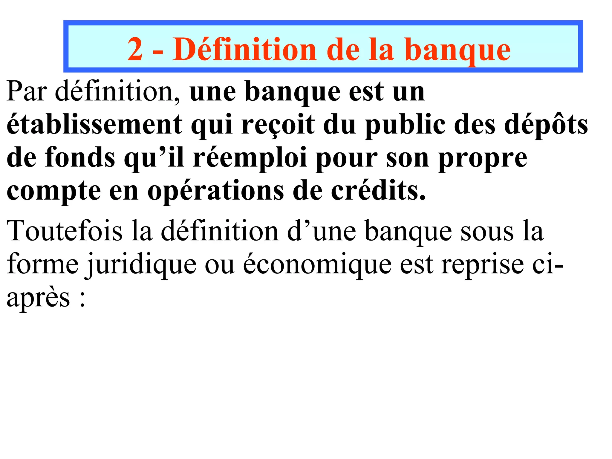 Une banque est un établissement recevant des dépôts pour réaliser des opérations de crédit et proposer des moyens de paiement. Elle joue un rôle clé d'intermédiaire entre offreurs et demandeurs de capitaux, en adaptant ses services aux besoins diversifiés des entreprises et des particuliers, notamment en matière de conseils, de financements et de gestion des risques. Les missions d'une banque comprennent la collecte des ressources, la distribution de crédits, et la gestion des opérations financières et de trésorerie.