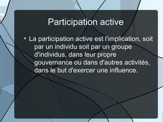 Le document explique divers concepts autour de la participation civique, y compris la participation active, la citoyenneté active, l'e-démocratie, la démocratie représentative et la démocratie participative. Il définit la démocratie représentative comme un système où les citoyens sont représentés par des élus, tandis que la démocratie participative favorise l'implication directe des citoyens dans les décisions politiques. Des exemples et des caractéristiques de chaque concept sont fournis pour illustrer leur importance dans la gouvernance moderne.