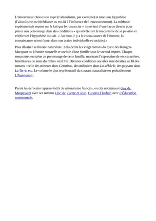Le naturalisme, successeur du réalisme, se concentre sur la représentation fidèle de la réalité tout en intégrant des contextes physiologiques et sociaux pour expliquer le comportement des personnages, en particulier ceux issus de classes défavorisées. Émile Zola, l'un des principaux défenseurs du naturalisme, prône une approche scientifique de la littérature, considérant le romancier comme un observateur et expérimentateur qui explore des questions sociales à travers ses œuvres. Les romans de Zola, comme ceux du cycle des Rougon-Macquart, illustrent cette théorie en dépeignant les influences de l'hérédité et de l'environnement sur les personnages et leurs conditions de vie.