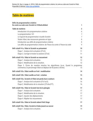 Ce document présente des défis de programmation créative utilisant le logiciel Scratch, visant à introduire les concepts de programmation à travers des histoires impliquant le personnage Vibot. Les défis sont organisés pour favoriser l'apprentissage de la pensée informatique, de l'analyse narrative à la création de solutions programmatiques. Il inclut également des ressources gratuites pour aider les utilisateurs à s'initier à Scratch et à la programmation créative.