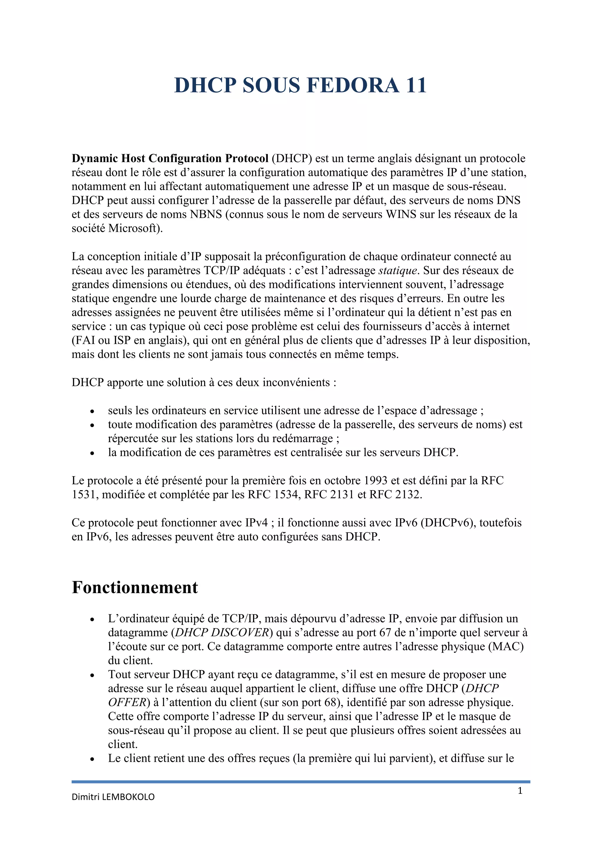 Le document détaille le fonctionnement et l'installation du protocole DHCP sous Fedora 11, qui automatise l'attribution d'adresses IP pour faciliter la gestion des réseaux. Il explique notamment la procédure d'attribution des adresses, le renouvellement des baux, et les configurations nécessaires sur le serveur DHCP. Des exemples de configuration et des options avancées pour personnaliser le serveur sont également fournis.